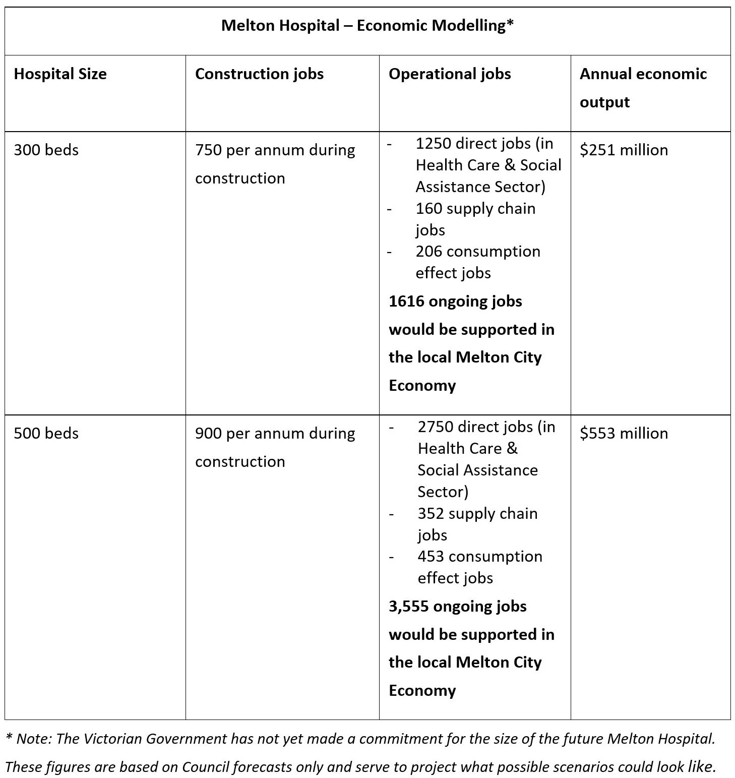 The above figures are modelled on the Melton Hospital alone, so should a private hospital eventuate in addition to a public hospital, along with other supporting health services, the economic benefit will multiply.